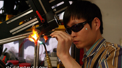 용접 전 마이터링과 가상 조립이 완료된 모든 튜브와 러그는 반드시 설계도 평면상에 위치해야 합니다. 조금의 오차라도 발견되면 조절 가능한 범위 내에서 설계도에 맞게 수정합니다. 제도상 각도 오차가 발생한다면 시트 튜브를 고정하고 다운 튜브와 BB 쉘 연결부위를 동 망치로 치면서 모양을 잡아줍니다.